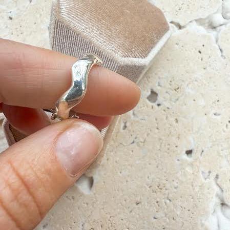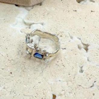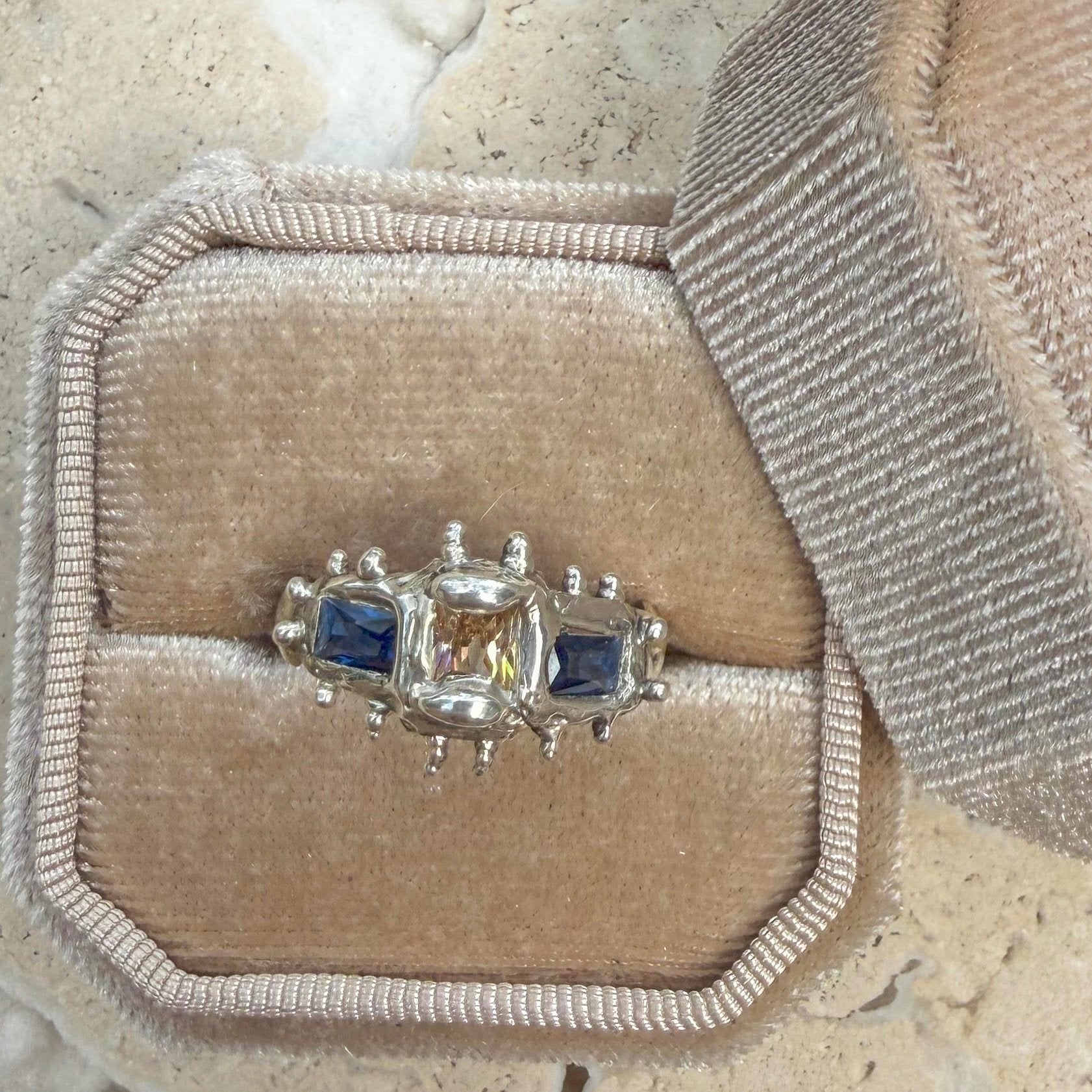 Meet the Midnight Ring: a stunning piece from our made-to-order collection that embodies elegance and individuality. Featuring two vibrant sapphire-blue Grade 5 CZ Nano stones and a warm champagne center stone, this ring is set in a polished, wave-patterned band that captures light from every angle. The Midnight Ring’s flowing design adds a soft, mesmerizing shimmer to any outfit—perfect for stacking or wearing solo. Embrace a timeless look with a unique twist, crafted just for you.